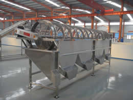 滾筒分級(jí)機(jī)又稱為鼠籠式分級(jí)機(jī):除機(jī)架傳動(dòng)部分,其余均為不銹鋼衛(wèi)生級(jí)304制作,篩網(wǎng)先沖孔,后經(jīng)機(jī)械卷圓處理,使之在使用過(guò)程中不傷害物料,篩網(wǎng)孔徑也可根據(jù)用戶要求設(shè)計(jì)制作,產(chǎn)品通過(guò)提升機(jī)輸送到分級(jí)機(jī)里面,由于傳動(dòng)作用,滾筒在不停地運(yùn)轉(zhuǎn),物料從小到大分級(jí)出來(lái)??蓪⒃戏譃?-10等級(jí)。大棗分級(jí)機(jī)使用范圍:本機(jī)適用于大棗、冬棗、小西紅柿、蒜米、山楂、桃子、胡蘿卜、桔子、香菇、土豆、洋蔥等分級(jí)使用,具有分級(jí)標(biāo)準(zhǔn)、效率高等優(yōu)點(diǎn),配套調(diào)速電機(jī)及防撞墊,可根據(jù)品種調(diào)節(jié)速度減小撞擊力,保障產(chǎn)品無(wú)破損。