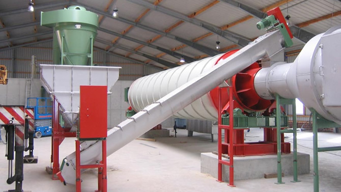 優(yōu)內(nèi)克轉(zhuǎn)筒烘干機(jī)的熱源來(lái)自燃燒裝置,工業(yè)烘干機(jī)采用順流式加熱方式。因此需要烘干的物料從進(jìn)料箱、進(jìn)料溜進(jìn)入筒體,隨即被螺旋抄板推向后端。由于烘干機(jī)傾斜放置,物料一方面在重力和回轉(zhuǎn)作用下流向后端,另一方面物料被抄板反復(fù)抄起,帶至上端再不斷地?fù)P撒下來(lái),使物料在筒內(nèi)形成均勻的幕簾,充分與筒內(nèi)的熱氣流進(jìn)行熱交換,由于物料反復(fù)揚(yáng)撒,所含的水分逐漸被烘干,從而達(dá)到烘干的目的。