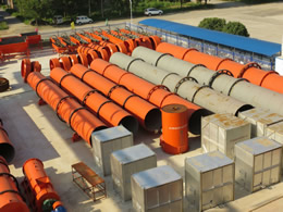烘干機(jī)系統(tǒng)密封性能好,并配有完善的除塵裝置,粉塵小外溢,操作環(huán)境好。選用LX型多組合式揚(yáng)料板,使物料進(jìn)入烘干筒內(nèi)呈雨?duì)盍夏?,增加了物料與熱空氣的接觸面,避免了熱空泛的發(fā)生