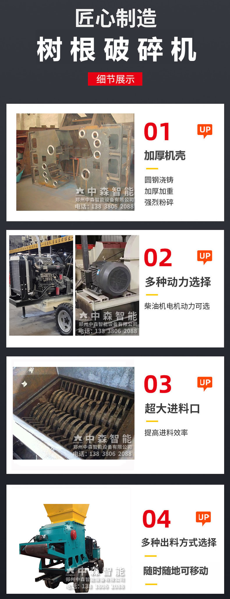 【產(chǎn)品名稱】樹根破碎機(樹疙瘩破碎機、移動式樹根破碎機)可加裝輪子移動,使用更方便,上客戶可通過喂料設備或鏟車直接將樹根等大型木料進行直接破碎切片。如果使用現(xiàn)場沒有配套電力,我公司可為客戶配備相應的柴油機代替電動機動力,解決了山區(qū)、林場的無動力問題