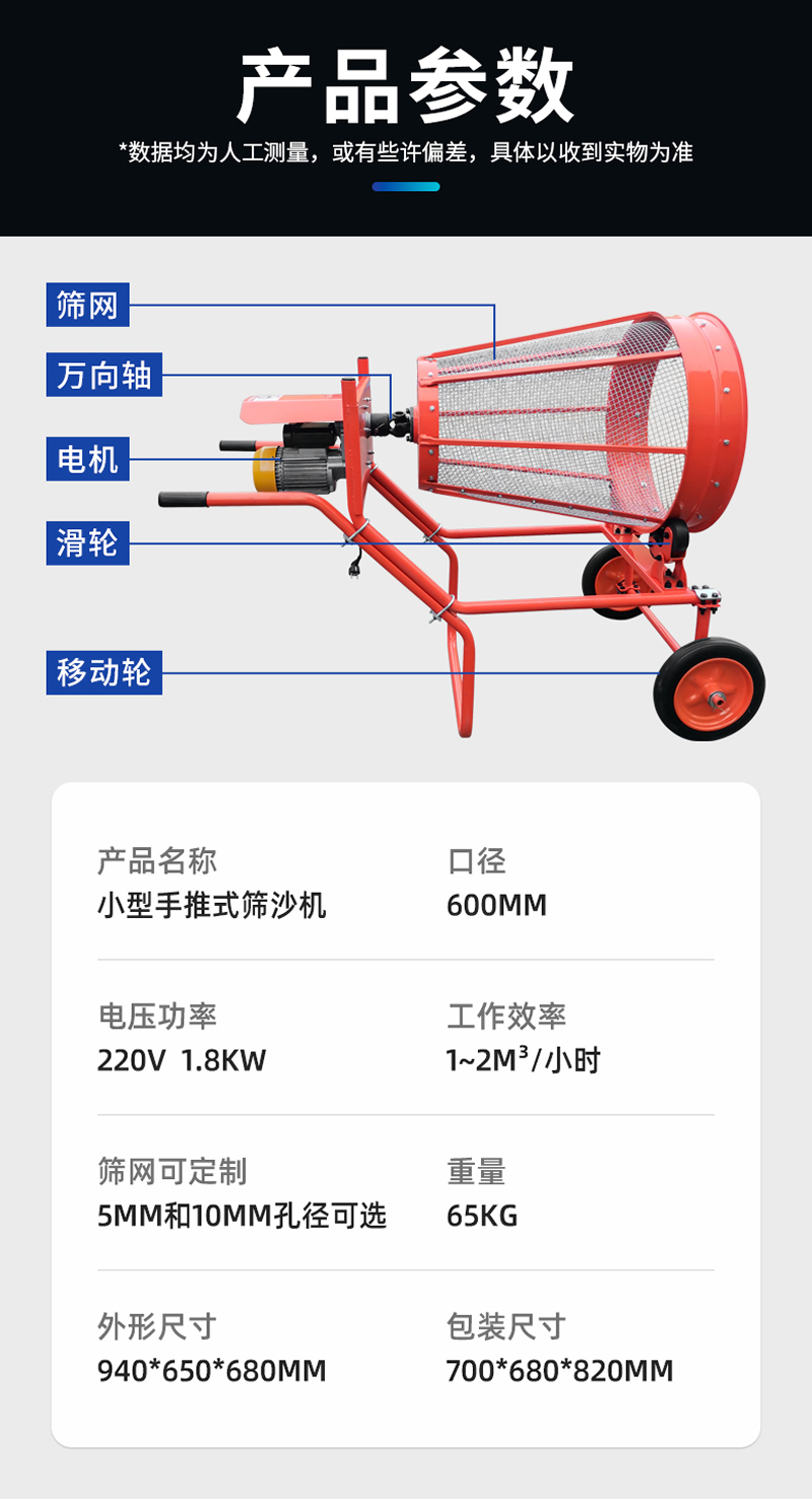 2、篩分速度快:該機每小時可篩5-15噸,人工每小時篩沙10噸,它是人工的10多倍。使用方便省力:該機進料高度低、體積小、重量輕、移動靈活、操作方便,適用于多種施工現(xiàn)場。應(yīng)用范圍:適用于大小建筑工地,煤場、糧食、炮廠、鑄造、種花苗圃、藥材、建筑砂漿等.