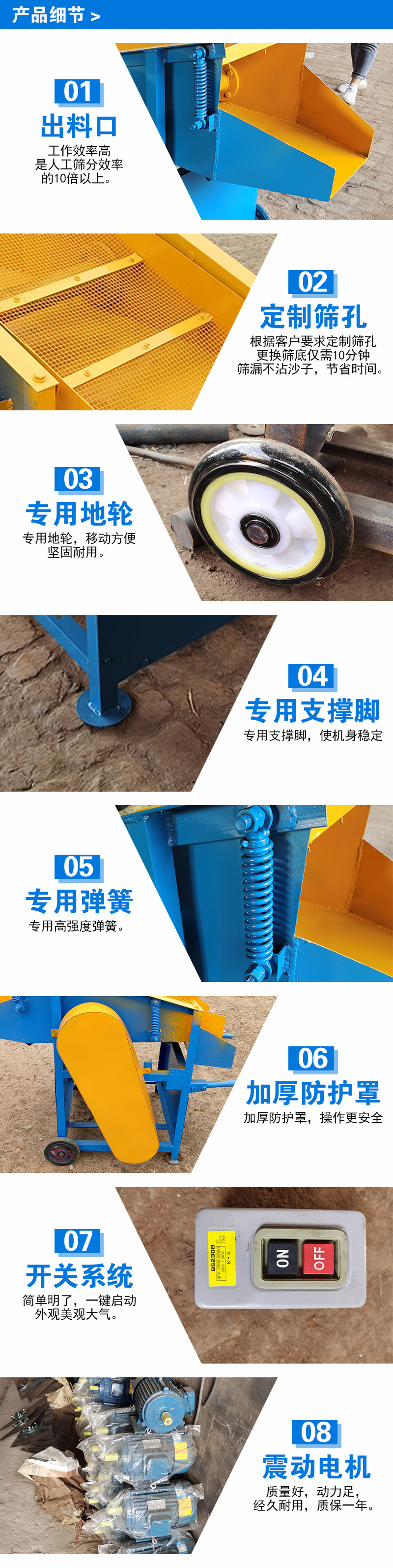 2、電動(dòng)篩土機(jī)在運(yùn)行時(shí)不準(zhǔn)檢修、注油、調(diào)整、觸摸。設(shè)備檢修或清理時(shí)應(yīng)關(guān)閉(切斷)所有總、分電源,并掛攀上禁止合閘,有人工作 - 示 - 。鏟車裝卸砂時(shí),不準(zhǔn)撞擊土壤篩土機(jī),放料時(shí)應(yīng)緩慢均勻給料,不準(zhǔn)猛砸,以免設(shè)備發(fā)生變形影響使用。雨天應(yīng)停止工作,對(duì)電機(jī)、閘箱應(yīng)做防水處理,以免造成安全事故.