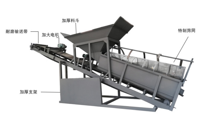 3、篩分效率高:設(shè)備設(shè)有梳型清篩機(jī)構(gòu),在篩分過程中,不管進(jìn)入篩分筒的物料多臟、多雜都可以篩分從而提高了設(shè)備的篩分效率;